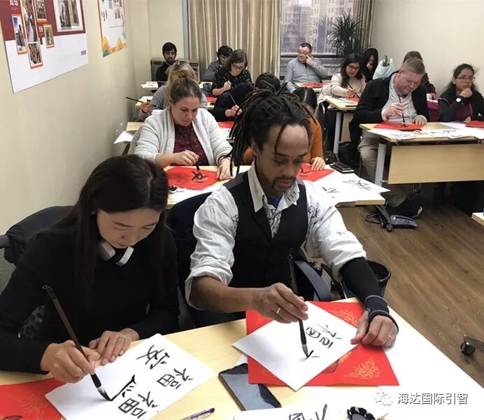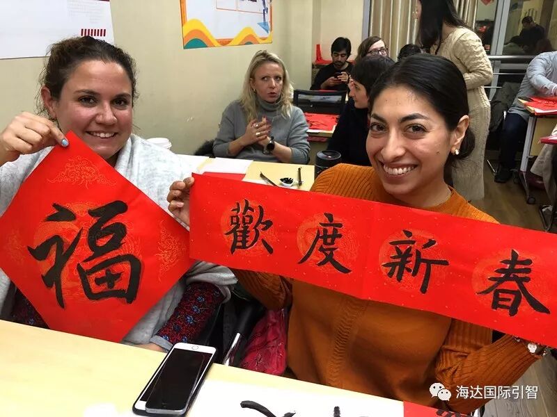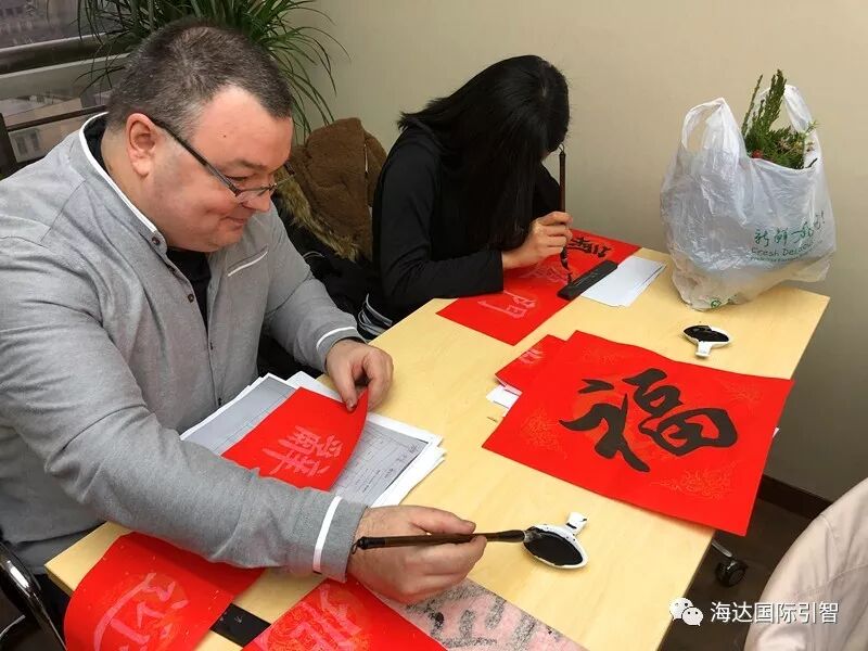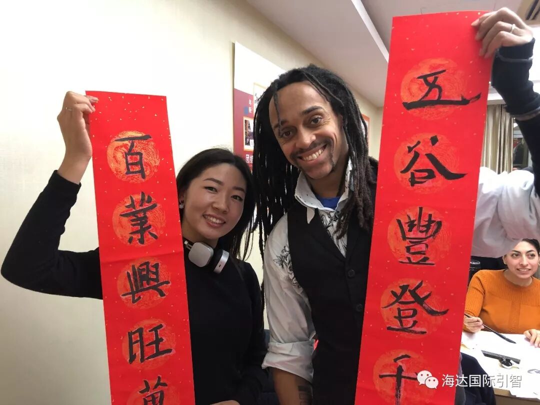 12月21日,海达杭州培训室洋溢着节日的热情,今天举行的是用中国书法写春联的外教活动。